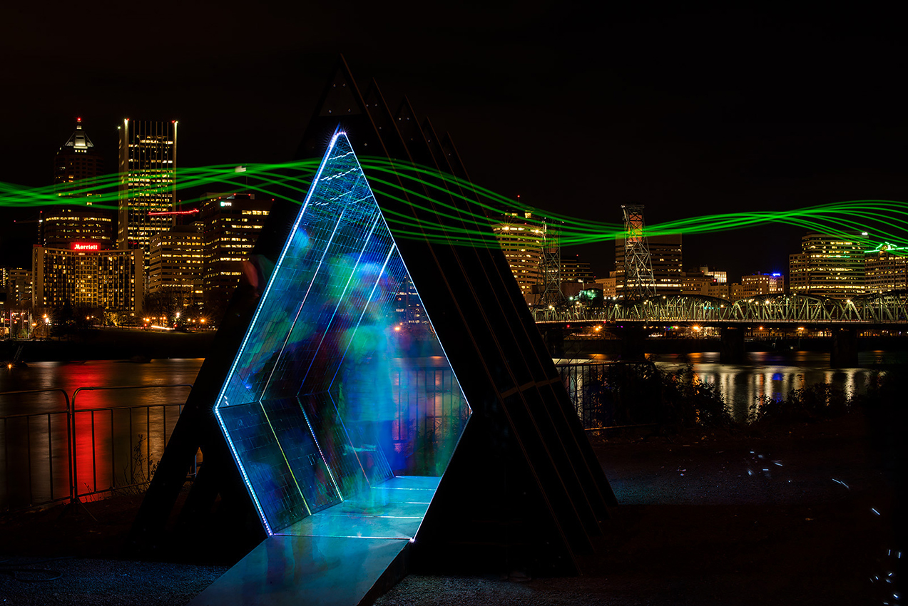 The Lumascope is a large, walkthrough kaleidoscope that reflects the city lights, neighboring Portland Light Festival projects, and the users within, creating various patterns and possibilities. Made up of thousands of square mirrors within a classic A-frame structure, the Lumascope offers two experiences: the activity within (from the interior) and the view through (from the exterior) to what is beyond. The Lumascope is designed for 24-hour use, using natural light during the day and LED lights at night for an augmented experience.